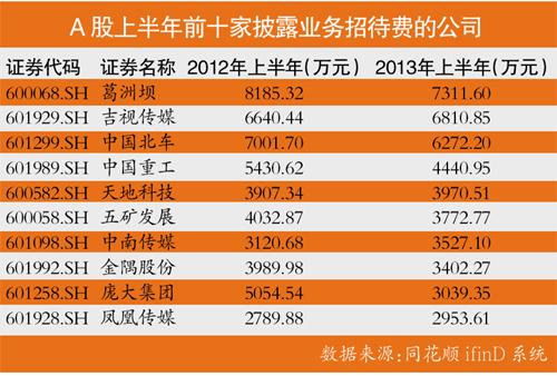 同花顺的数据显示,上半年,沪深两市共有1629家公司在半年报中披露了上半年的业务招待费,其业务招待费累计46.65亿元。而2012年全年,上市公司累计招待费高达137.98亿元。