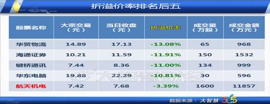 9月6日大宗交易折溢价率排名后5中,折价幅度最高的股票为华贸物流,折价率达到13.08%。成交金额最大的是航天机电,以折价3.39%成交11857万元。另外四只股票华贸物流、海通证券、键桥通讯和华东电脑的成交额分别为968万元、1532万元、999万元和596万元。