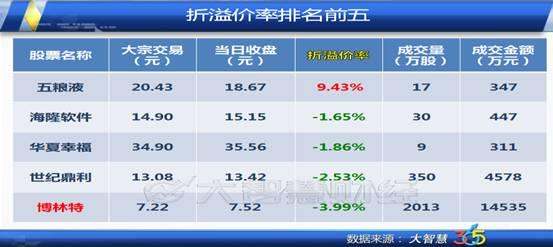 9月6日的大宗交易折溢价率排名前5中,只有五粮液为溢价交易,以溢价9.43%成交347万元。另外四只股票博林特、海隆软件、华夏幸福和世纪鼎利分别折价成交14535万元、447万元、311万元和4578万元,其中博林特成交金额最大。