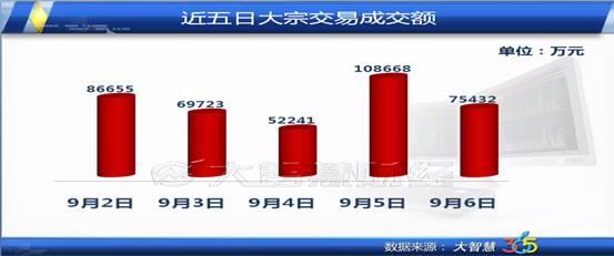 参与互动(0)9月6日上证股指涨0.83%,收出一根中阳线,创业板的表现略微强于主板,上涨1.22%。在此局势下,大宗交易的成交金额相比上一个交易日有明显减少,共成交7.54亿元。从换手率来看,大宗交易最活跃的股票主要分布在仓储物流和软件服务这两个行业,行业换手率分别达到29.6%和14.94%,其中表现最活跃的股票是华贸物流,它的换手率为29.6%。