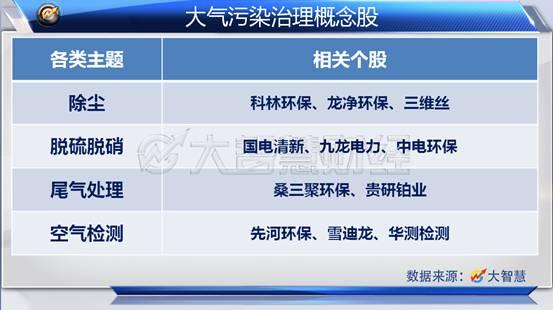 大气污染治理的主题主要分除尘,脱硫脱销,尾气处理,空气检测四部分。每年秋冬季,都是雾霾天气的高发期,特别是一些重点城市污染严重,所以相关股有爆发机会。投资者应挖掘大气治理中业绩有保障品种,并选择在股价出现回调时关注。(新华网-大智慧财经联合报道)