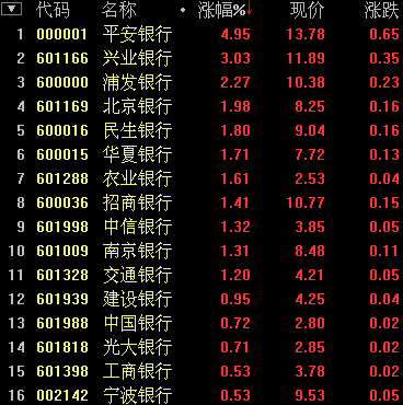受益于此消息,今日早盘银行个股全线飘红,截至发稿,平安银行领涨4.95%,兴业银行涨3.03%,浦发银行涨2.27%,北京银行涨1.98%,民生银行涨1.80%。