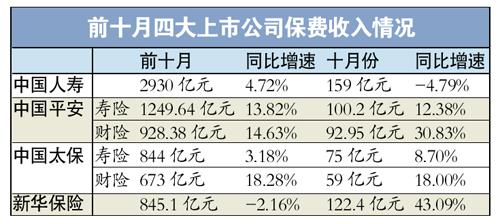 数据显示,今年前十月,四家上市公司的寿险保费收入同比出现回暖,中国人寿、平安寿险、太保寿险与新华保险分别实现原保费收入2930亿元、1249.64亿元、844亿元、845.14亿元,与去年同期相比累计保费收入涨跌幅分别为4.72%、13.82%、3.18%、-2.16%。分析师表示,尤其在寿险费率市场化改革之后,新费改的产品一枝独秀,为保费提升贡献了力量。