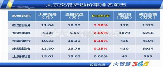 12月25日的大宗交易折溢价率排名前5中,有4笔为溢价交易,其中松芝股份以溢价7.5%成交120万股,金额为1325万元。东源电器以溢价2.65%成交6256万元。招商银行溢价0.19%成交4504万元,永辉超市溢价0.15%成交5934万元,只有上海机场平价交易了595万元。前4只股票虽为溢价交易,但整体交易金额都不大,对股价走势难以产生影响。
