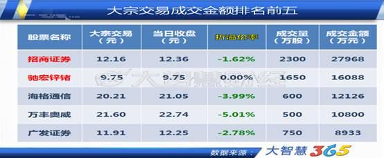 12月25日的大宗交易成交金额排名前5中,成交金额最大的是招商证券,以折价1.62%交易了2300万股,金额达到27968万元。位居第二的是驰宏锌锗,交易额为16088万元。排列第三的是海格通信,金额也达到了12126万元。牛股万丰奥威以10800万元的成交额屈居第四,广发证券排在第五,成交额为8933万元。自今年6月以来,万丰奥威上涨之路开启,至12月24日,股价创出历史新高,累计涨幅达229.13%。创新高后,有资金通过大宗交易平台减持,万丰奥威短期或有一定调整风险。