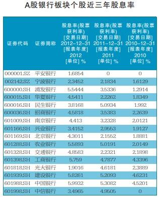 在A股中,上市银行的整体股息率则要大大高于市场的整体表现。数据显示,2013年度,上市银行整体股息率为5.6412%、2012年度为4.1894%、2011年度为3.1463%、2010年度为2.9973%。