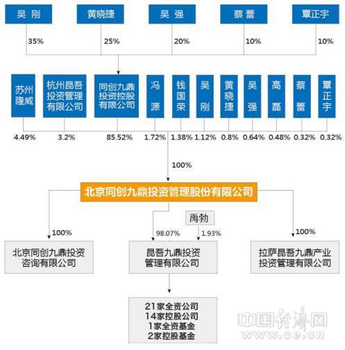 资料显示,定增完成后,九鼎投资主要控制人吴刚、黄晓捷、吴强、蔡蕾、覃正宇实际持有股份数分别为391.6万股、289.29万股、224.09万股、117.18万股、112.07万股。以定增价每股610元计算,吴刚、黄晓捷、吴强、蔡蕾、覃正宇账面财富依然达到23.89亿元、17.65亿元、13.67亿元、7.15亿元、6.84亿元。