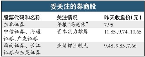 个股方面,短线方面受到重点关注的是年报“高送传”的东北证券;中长线关注的是资本实力雄厚的中信证券、海通证券、广发证券等;此外还有业绩弹性较大中型小券商,如西南证券、长江证券和东吴证券等也被机构看好。