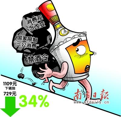 国家统计局数据显示,2013年我国白酒行业规模以上企业,无论是产量还是销售收入增幅均创下2009年以来的最低水平。从刚刚收官的上市公司2013年年报来看,去年14家白酒上市公司的市值已缩水2552亿元。业内人士认为,全行业性的低迷背景下,五粮液降价将带来连锁反应,带动更多高端白酒价格松动。