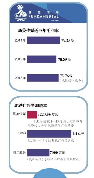 2013年,基美传媒媒体阵地成本为3220.56万元,其中包括租金和独家运营费。每年付出3000多万元,基美传媒就取得了上海地铁1—13号线、北京部分线路的大屏幕视频媒体广告业务的独家经营权。