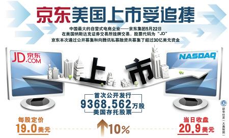 5月22日数据显示,京东首日上市以21.75美元/股价格开盘,较发行价19美元/股上涨14.47%,市值达到297亿美元。不过,在IPO(首次公开招股)首日股价上涨10%之后,京东股价上周五报收于20.10美元/股,下跌近4%。