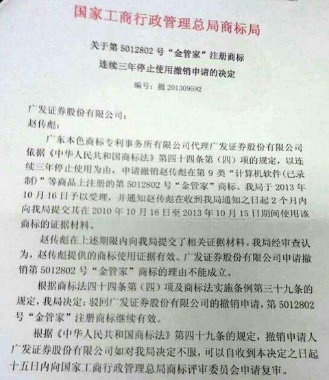 对此,赵传彪解释称,2013年10月份,广发证券方面曾以连续三年停止使用为由,向国家工商行政管理总局商标局申请撤销赵传彪在第9类“计算机软件(已录制)”等商品上注册的第5012802号“金管家”商标。