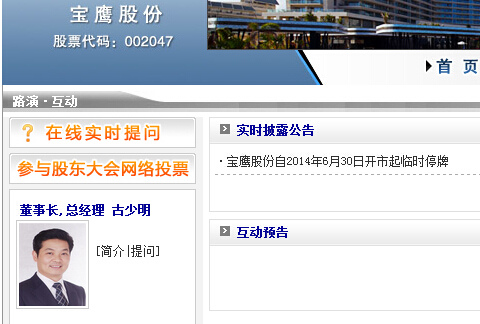 今年6月30日,宝鹰股份突然停牌,其盘前公告称,“因市场出现实际控制人、董事长古少明先生的有关言论,需要对相关事项进行核实,股票6月30日起停牌。待有关事项核实清楚后,公司将及时发布公告,同时申请股票复牌。”但公告并未披露“有关言论”的具体内容。之后的7月7日、7月14日、7月21日,宝鹰股份陆续发布三份公告,均表示“相关事项尚在核实中”,或“仍需对相关事项进一步核实”。据坊间传闻,古少明已失联。昨天,有媒体报道称,宝鹰股份管理层核心人士透露,他们已有一段时间没有见过古少明,也未能联系上他。