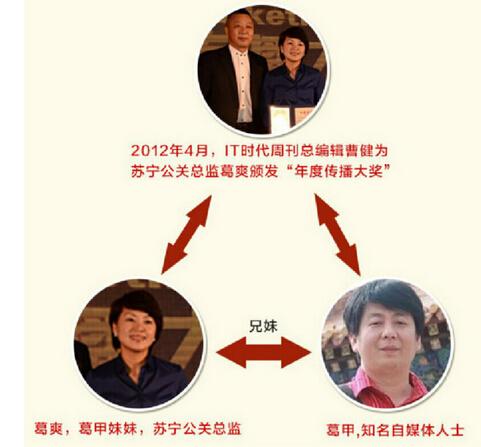 在8月7日傍晚,颜乔在微博上发了一条图文并茂的旧闻:“2013年5月,IT时代周刊总编辑曹健发刊词:苏宁云商公关负责人葛爽是我新近认识的。这个北京女孩给我的感觉是,柔弱的外表下有着非常执着的内心。而当葛告诉我,她的公关团队只有3个人时,我真的感到非常惊讶。(我真的感到非常惊讶,不是四个人么?葛甲老师不算?)”并在微博中配发了两张图片,分别是“IT时代周刊为苏宁公关总监葛爽颁发年度传播大奖”和“苏宁公关总监葛爽系葛甲妹妹的三方关系图”,点名称苏宁云商品牌部媒体总监葛爽是自媒体人葛甲的妹妹。微博发出后,瞬间引爆了财经圈,招来多家媒体的围观。