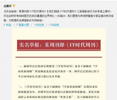 7日下午,阿里巴巴公关总监颜乔在其认证微博上发布声明称,已实名向国家有关部门举报《IT时代周刊》,指出该杂志及其下属网站IT商业新闻网长期对阿里巴巴进行“舆论胁迫及恶意侵害商誉”。