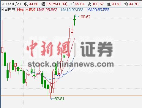 周二阿里巴巴股价迎来七连涨,盘中该股首次突破百元大关,最高触及100.67美元,收盘涨1.93%报99.68美元。