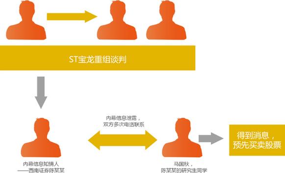 2011年12月,ST宝龙停牌前夕,马国秋从研究生同学西南证券投行陈某某处获知内幕信息,累计买入"ST宝龙"两日成交总额1/5的股份。停牌2个多月后,ST宝龙于2012年3月20日复牌并公告收购报告书等重组文件。而从该日起,ST宝龙开始疯涨之路,从2012年3月20日至4月16日,连续15个交易日涨停,累计涨幅达到惊人的107.94%,股价也由8.44元飙升至17.55元。马国秋于第14个涨停日选择卖出获利了结,实际获利高达136.89万元。