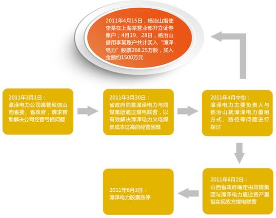 杨治山,案发前担任中信证券研究部总监、电力行业首席分析师,长期从事电力行业分析工作,是业界从业时间最长的电力分析师之一。2010年5月20日起被聘为漳泽电力独立董事。2011年4月在参与上市公司筹划重大资产重组的过程中接触内幕信息,随后借用他人账户买入股票268.25万股,交易金额约1500万元。