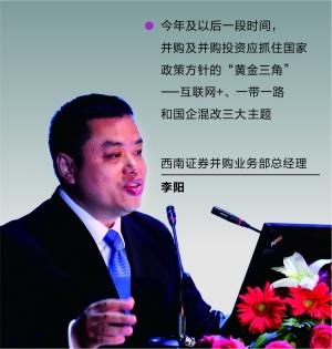 在由证券时报主办的“2015中国投行·创投跨界融合高峰论坛”上,西南证券并购业务部总经理李阳表示,做并购及并购投资首先要讲政治经济学,也就是并购和投资应该符合国家大势,今年及以后一段时间应抓住国家政策方针的“黄金三角”——互联网+、一带一路和国企混改三大主题。