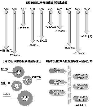 据统计,6月15日以来大盘千点急跌期间,两市净流出资金7418亿元。其中,沪市主板净流出4069亿元,深市主板净流出1272亿元,中小板、创业板分别净流出资金1444亿元、634亿元。从各交易日看,6月15日、6月16日、6月26日3个交易日均净流出超过千亿元。