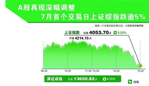 A股7月首个交易日“出师不利”,未能延续前日反弹之路,重回跌势。至收盘,沪指下跌5.23%报于4053.70点,深成指下跌4.79%报于13650.82点,创业板指下跌3.47%报于2759.41点。昨天市场再现2100多只个股下跌,近千只个股跌停。