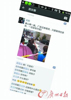 广州日报佛山讯 (记者杨博 通讯员张聪、钟坤摄影报道)佛山一名男子潘某在微信的聊天群里看到一张跳楼自杀的图片,便轻信了群里朋友所说的“这是发生在季华路的一起跳楼事件”。随后,潘某在自己朋友圈中分享跳楼图片并回复朋友称,这是季华路上某银行大楼上发生的一起股民跳楼事件。