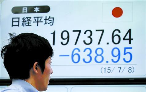 7月8日,在日本首都东京,一名行人经过一块电子股指显示屏。