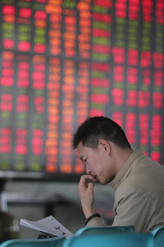 某证券营业厅里,一个年轻股民在琢磨大盘走势。