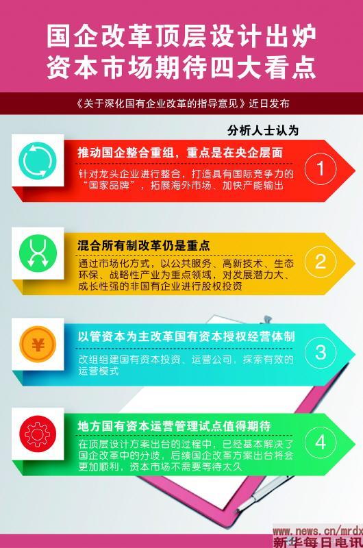 民生证券宏观分析师朱振鑫指出,本轮国企改革的一大优势是,资本市场和金融工具比以往更完善,为推动国资证券化创造了条件。国资证券化一方面可以解决谁来买国有资产、谁来盘活国有资产的问题,另一方面可以通过公开市场的竞价和监督促进政企分离,有效避免国有资产流失的问题。 (记者桑彤、潘清)据新华社上海9月15日电