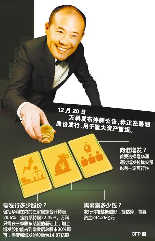王石究竟需要多少钱才能保住万科?记者从万科三季报中看到,目前华润持股比例为15.25%,万科合伙人持股平台盈安合伙持有4.14%的股份,刘元生持股比例为1.21%,三者合计持股比例20.6%,可以被视为事实上的“盟友”,加上增发股份只需占到增发后总股本30%即可,需要新增发的股数为14.87亿股。