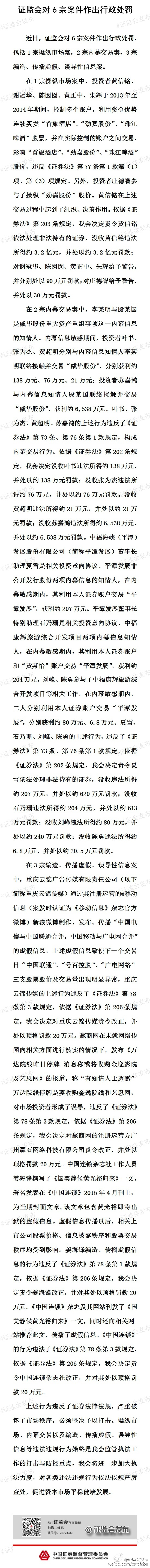 中新网5月6日电 据证监会官方微博消息,近日,证监会对6宗案件作出行政处罚,包括1宗操纵市场案,2宗内幕交易案,3宗编造、传播虚假、误导性信息案。