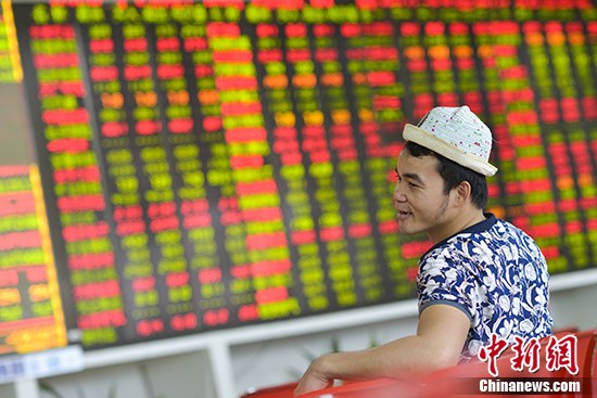 8月23日,海口某证券营业部大盘前的股民。 中新社记者 骆云飞 摄