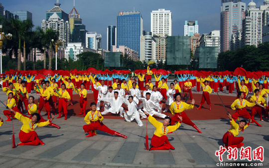 6月29日,310位老年人热情洋溢的在福州温泉公园组阵“花木兰”,为迎“全民健身日”,福州近2000多名离退休老干部和社会各界老年人参加老人健身展示会。他们最大的85岁,平均年龄在67岁。中新社发 张丽君 摄