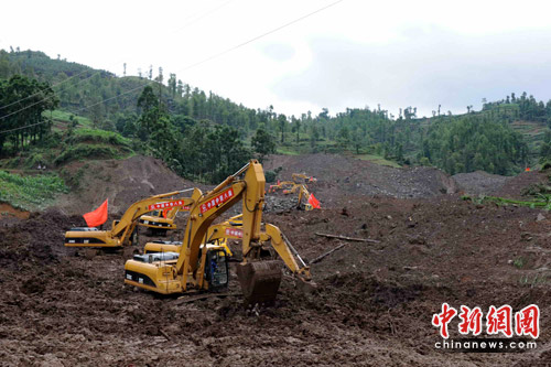 中新网贵州关岭6月30日电 29日下午,贵州省安顺市关岭县大寨村被山体滑坡掩埋的村庄,搜救人员已挖掘出部分被埋者的遗体。(曹多然 杜远 摄)