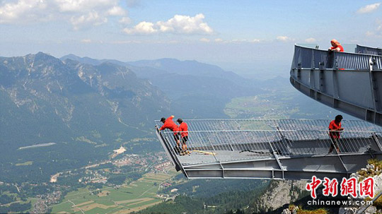 6月29日,德国南部格米斯科-帕腾科奇附近的Alpspitze山上,工人们正在距离地面垂直高度约为1000米的地方安装观景台的部件。这座观景台将于7月4日正式对外开放。