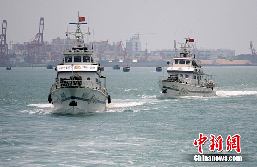 6月30日上午,中国渔政302、海警46012等12艘船艇分别从海南洋浦、广西北海启航,开始为期11天的北部湾渔业海上联合监管行动。图为海南海警船艇编队赴北部湾巡航。中新社发 付美斌 摄