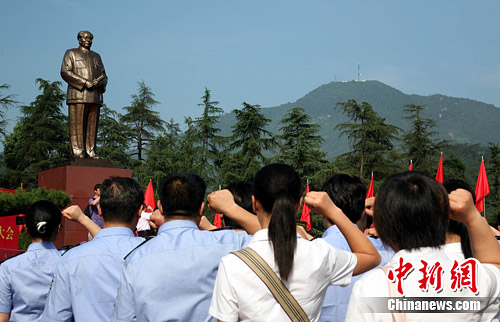 中国共产党即将迎来建党纪念日,6月30日,湖南韶山市近万名中共党员齐聚毛泽东广场,在毛泽东铜像前宣誓,重温入党誓词。中新社发 白祖偕 摄