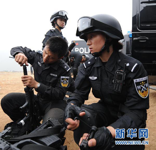 特警整理装备为演练开始做准备。李文 摄