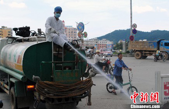 从6月13日到27日,暴雨横扫闽西北地区,致使山洪暴发、地质灾害频发,大量民房倒塌,基础设施损毁。图为6月28日,闽北建阳市卫生防疫人员在市区喷洒消毒液。截止6月28日,建阳市累计出动卫生防疫人员 845 人次,车辆 53 台次,消杀受灾面积达 595.43 万平方米,共使用漂白粉4.3285吨、消毒液3.313吨,已基本完成受灾地区卫生防疫消杀工作。中新社发 丁晓雄 摄