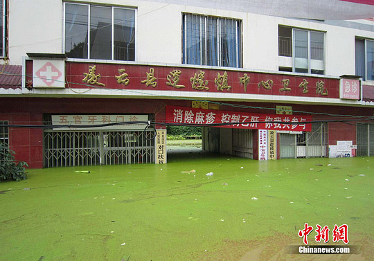 由于遭遇连日暴雨,广西凌云县逻楼镇内涝成灾,全镇一片汪洋,积水深达2米多高,民众只能用小机船和自制排伐作为交通工具。由于该镇所在地为一个小盘地,没有排水的地方,估计一个月后积水才能自然排完。6月27日20时至29日,广西凌云县遭遇罕见强降雨袭击,造成严重洪涝灾害。初步统计,当地已紧急转移一万多人。图为30日所摄逻楼镇被淹景象。黄燕飞 摄