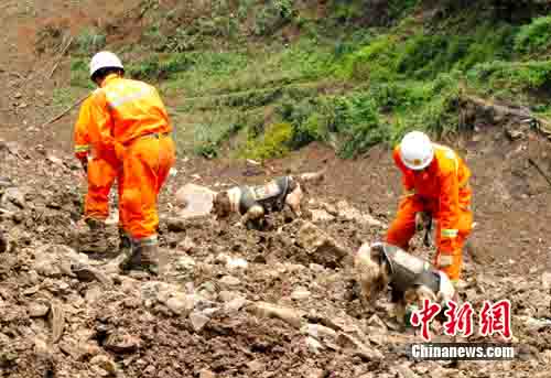 搜救犬仍在泥泞中搜寻被埋者的痕迹。