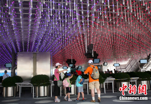 7月1日,上海世博会迎来开展以来高温天气,当天最高温度达37.4℃,上海气象部门发布高温橙色预警信号。世博园内高温天气没有挡住参观者的脚步,在中国、韩国、日本、沙特等国家馆外,来自国内外的参观者顶着高温天气排队等候进馆参观。图为世博园内高架桥下、排队棚、广场和一些馆内纷纷采取降温措施喷水雾。中新社发 刘忠俊 摄