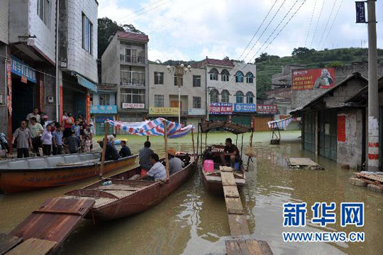 7月1日,在广西凌云县逻楼镇,街道成了临时码头。周华 摄