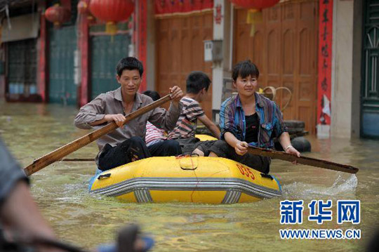 7月1日,在广西凌云县逻楼镇,居民乘船从街道上通行。周华 摄