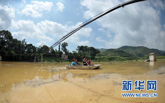 7月1日,在广西凌云县逻楼镇祥福村洪福屯,村民从被洪水淹没的田地里划船出行。周华 摄