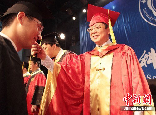 图为校长侯建国院士为学位获得者扶正流苏。中新社发 张娅子 摄