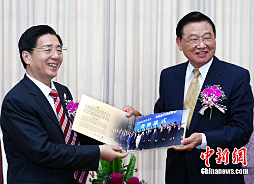 率团参访台湾的中共广西壮族自治区书记、广西经贸文化代表团团长郭声琨,7月2日在台北会见了海基会董事长江丙坤。中新社发 宋吉河 摄