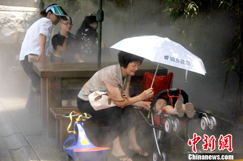 7月2日,许多市民在福州南后街的水雾系统“大空调”下纳凉。当日,福州由6月下旬的暴雨天迅速转入高温天,最高气温达38度,让许多市民感到不适。中新社发 王东明 摄