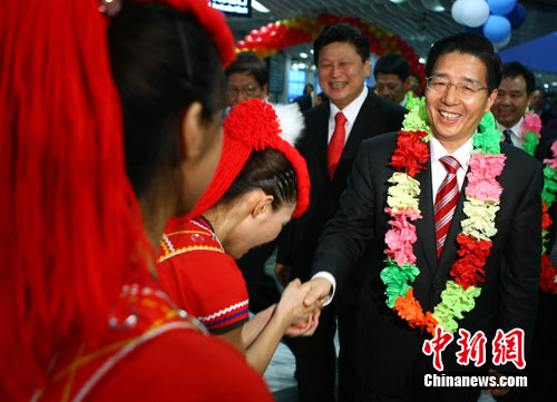 7月2日傍晚,在台湾参访的广西自治区党委书记郭声琨一行在台湾最大的县花莲县,受到当地政府和民众的热烈欢迎。中新社发 宋吉河 摄