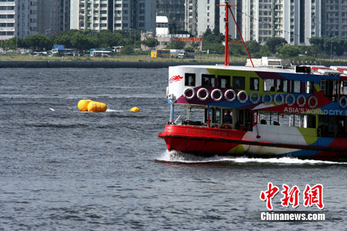 7月3日,香港天星小轮驶过直升机失事海域,黄色浮漂下是直升机残骸,为便于起吊作业由上游拖到湾仔海面位置。当天,一架由香港前往澳门的直升机,中午在上环信德中心起飞后不久堕海,机上13人全部获救。专家指,直升机起飞后不久发生巨响,需要紧急降落,可能与直升机的主要螺旋桨发生故障有关。中新社发 洪少葵 摄